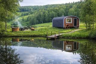 Весна на берегу озера, уютный глемпинг среди природы и центр притяжения — баня с лёгким паром. Тёплая купель под открытым небом, мангал с живым огнём, закаты в отражении воды и тишина, которую нарушает только треск дров.